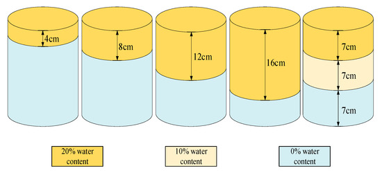 The experiment was completed at an irrigation station (108°24′ E, 34°18′ N, altitude 521 m). The station is the Key Laboratory of Agricultural Water and Soil Engineering in Arid Areas of the Ministry of Education and belongs to Northwest A&F University. First, the soils were air-dried, ground, and refined. They were then sieved through a 1.0-mm (no. 18) sieve. Finally, the soil samples were oven-dried at 105 °C for 24 h and stored for experiment. Based on the density of each soil sample, deionized water was fully mixed to prepare soil samples with the volume water content of 0%, 10%, and 20%, respectively. To reduce the influence of ambient temperature, the experiment was carried out at an indoor temperature of 24 ± 2 °C. The soil samples were placed for more than 8 h before starting the measurement. They were then placed into polyvinyl chloride (PVC) pipes (210-mm height, 67.5-mm diameter). The two-layer soil columns’ filling heights of the upper and middle wet soil (20% volume water content) were controlled at 0, 4, 8, 12, 16, and 20 cm, respectively. The three-layer soil column’s upper, middle, and lower layers are 7 cm, with the soil of 20%, 10%, and 0% water content. Each layer is separated by PTFE (Poly tetra fluoroethylene), as shown in Figure 1.
