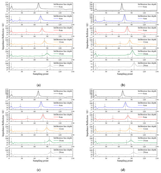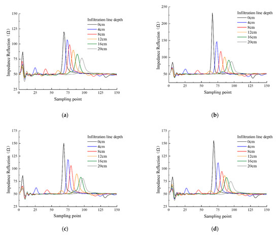 Figure 3 indicates the consistency of the four types of soils’ waves when measuring infiltration lines at different depths. The first reflection of microwave occurs when it passes through the interface between air and soil. This peak is the starting reflection point of TDR. When the microwave propagates to the soil infiltration line, it reflects and forms a reflection peak as the medium impedance changes, with the reflection point being the soil infiltration line’s position. Soil samples with different volumetric water content have different dielectric constants [37]. As a result, as the infiltration line deepens, the overall volume water content of the soil increases, with reduced signal propagation speed and backward-moving reflection peak at the probe’s end. To show the peak movement of soil impedance more clearly with the change of soil infiltration line depth, the measured waveforms of different soil infiltration line depths for each soil are shown in Figure 4.