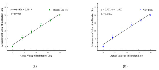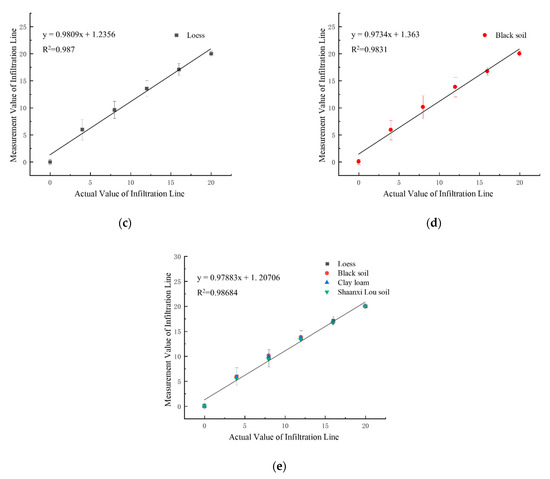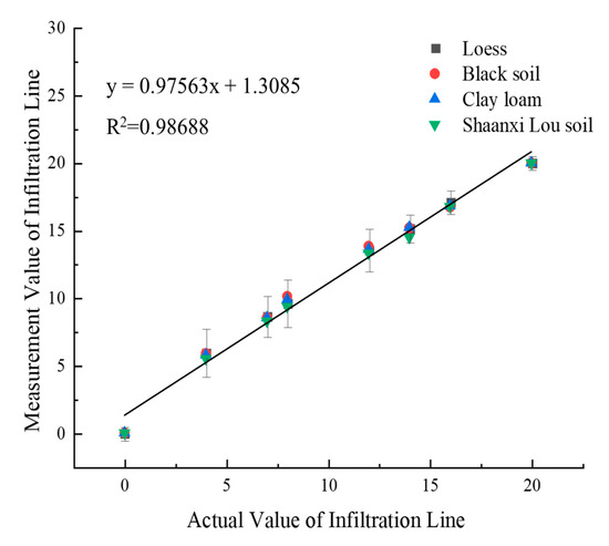 The actual depth of the soil infiltration line is taken as the abscissa, with the measured value of the soil infiltration line as the ordinate. The soil infiltration lines’ positions for four different textures were fitted individually and concatenated, as shown in Figure 5.