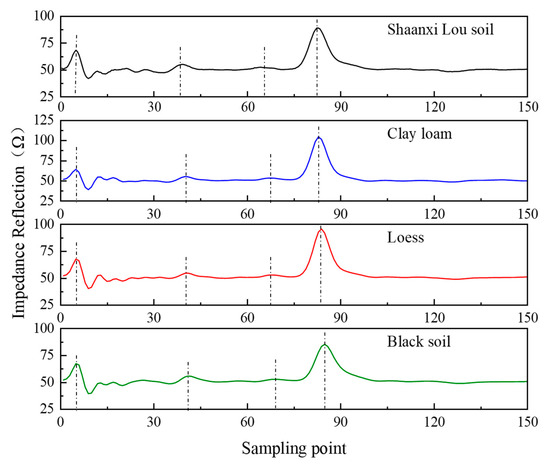 Figure 4 reveals that the starting reflection peak of Shaanxi Lou soil, clay loam, loess, and black soil are all at the fifth sampling points. When there is no soil infiltration line in the soil samples, the medium where the probe is located is uniform, without reflection of the microwave signal. Therefore, the obtained TDR waveform only shows the two peaks at the starting and the end of the probe. When the soil infiltration line is 4, 8, 12, or 16 cm, the water content of the layered soil where the probe is located is different. This phenomenon caused the medium’s changes and the reflection of electromagnetic waves, so there is an additional infiltration line reflection peak between the starting reflection peak and the end one. The positions of each sampling point are shown in Table 2.