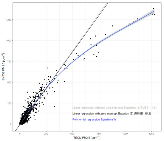 We used hourly PM2.5 measurements from a FDMS-TEOM during a period of smoke from peat fires near Port Macquarie (NSW) to develop a calibration curve for the SMOG units. Ambient hourly PM2.5 concentrations up to 1300 μg m−3 were measured during the sampling period between August–December 2019. Figure 2 shows the fitted lines for the two measurements methods, with the relevant equations shown below.