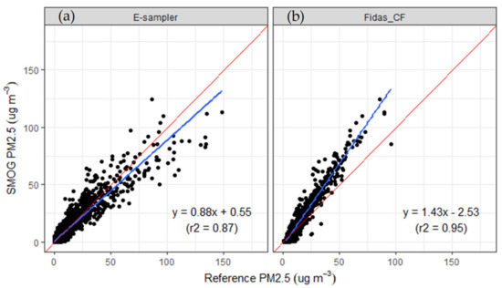 Scatterplot of hourly PM2.5 concentrations measured with the SMOG units compared to (a) the E-sampler and (b) Fidas_CF (both of which have been corrected against gravimetric mass measurements). Blue lines show linear least-squares fit; red line represents 1:1 line.