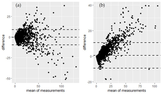 - Bland, J.M.; Altman, D.G. Statistical methods for assessing agreement between two methods of clinical measurement. Lancet 1986, 327, 307–310. [Google Scholar] [CrossRef]