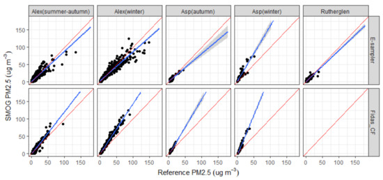 To check the accuracy of the SMOG units, we compared the hourly PM2.5 concentrations measured with the calibrated SMOG units using gravimetrically corrected measurements from the collocated Fidas (Fidas_CF) and E-sampler. Table 4 shows a summary of the statistical parameters using the different calibration curves for the SMOG calibration as defined in Section 3.1. The data shows that there is a minimal difference between the different calibration curves. Therefore, we used the calibration curve with zero intercept (Equation (2)) for the remaining analysis of the data sets. Table 4 also shows the statistical analysis of site- and season-specific intercomparison using Equation (2). Intercomparisons between calibrated SMOG (using Equation (2)), Fidas and E-sampler are shown in Figure 3.