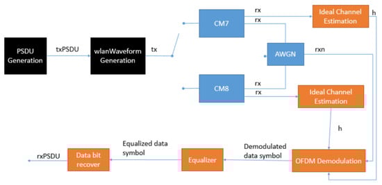 The platform is based on the WLAN toolbox of MATLAB, and it offers the transmission of the IEEE802.11be waveform among two nodes. In Figure 2, the simulation steps are represented with a block diagram model. After the PSDU generation, there is its passage to the WLAN Waveform Generation block, where is generated the PPDU. The PSDU configuration requires the following parameters: PSDU length, Modulation Coding Scheme (MCS), guard interval, channel coding, and channel bandwidth.