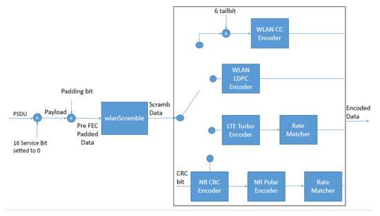 According to the configuration defined for the PSDU, the modified block offers the choice between four-channel coding techniques: WLAN CC, WLAN LDPC, LTE Turbo, and NR Polar. As shown in Figure 4, only the WLAN LDPC has a unique step in the encoding. In WLAN CC, a zero-bit sequence, defined tail bit sequence, is included in the data before the encoding. While concerning LTE Turbo, the encoded blocks have a code rate of 1/3, then a Rate Matcher block is added. This step is necessary for matching with the code rate defined in MCS. Finally, in NR Polar, the PSDU is concatenated with a CRC bit sequence before the encoding. Then, the obtained block passes to a Rate Matcher for the obtainment of the MCS code rate.