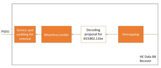 The Data Bit Recover (Figure 5) recovers the PSDU from the OFDM symbols reserved for the data. This process consists of four main steps: demapping, decoding, descrambling, and removing the additional bits. Among these steps, this work proposes an adaptation of the IEEE 802.11 decoding block to analyze the channel coding techniques, as shown in Figure 6.