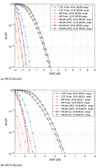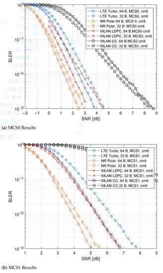 Figure 8a,b show the results for MCS0 and MCS1, respectively. Comparing the results with Figure 7a,b, it is notable that results are worse for all the cases. In MCS0, 5G NR Polar are shifted to the right by about 4dB, as WLAN LDPC and LTE, while WLAN CC is about 5 dB worse. The trend is similar to the MC1 case.