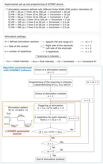 Algorithm illustrating parameterization of SYNERGY software to implement Protocol 1. Protocol 1 was designed to perform scanning in intensities with different pulse widths using a TIME implanted in a single fascicle (TIME#1). This experiment was implemented to ensure STIMEP ability to automatically deliver finely tuned stimulations but also to assess the relative impact of both intensity and pulse width in intrafascicular stimulation selectivity.