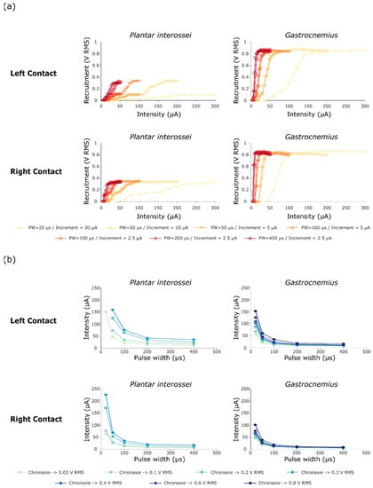 The first stimulation protocol (Figure 3) aimed both to ensure the ability of STIMEP to comply with a precise microstimulation and also to investigate the impact of both the stimulation intensity and the pulse width on selectivity when implanting one TIME in a single fascicle. Data obtained after scanning in intensities were processed to obtain the RMS values. These values were then combined to plot recruitment curves (Figure 4a) and chronaxie-rheobase-like curves (Figure 4b). We focused our analysis on intrafascicular selectivity and compared the recruitment profile of two muscles innervated by the tibial fascicle—i.e., the plantar interossei and the gastrocnemius muscles [].