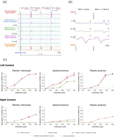 Raw signals recorded during implementation of the second stimulation protocol and corresponding recruitment curves. (a) Example of raw data obtained when stimulating with left contacts for a 300 µA intensity (i.e., DSU #1 = 4 Hz, DSU #4 = 8 Hz, I = 1, j = 2 and k = 4—configuration based on Supplementary Figure S1). (b) Close-up on the three muscles CMAPs obtained after stimulating with either a single (DSU #1) or two DSUs (DSU #1 and DSU #4)—These signals correspond to those marked with a star in (a). (c) Recruitment curves obtained for each muscle following the implementation of the stimulation protocol. Note that the “cumulated RMS T#2T#3” curve corresponds to the calculation of the RMS theoretical value obtained by linear summation of the individual responses. Similarly, the presence of two curves corresponding to the stimulation with two DSU is linked to the protocol repetition after the reversal of the stimulation frequencies on both DSUs.