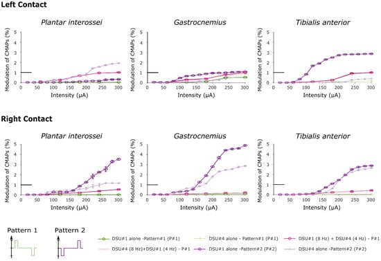 Stimulations frequencies of 8 and 4 Hz were retained for multi-TIME DSU parameterizing while scanning was performed with various intensities, from 60 to 300 µA (by steps of 60 µA) with 8 and 4 repetitions respectively, symmetrical biphasic pulses—to generate recruitment curves. Two sessions were performed successively to compare the results obtained with single a TIME stimulation—with TIME#2 or TIME#3 alternatively—to those achieved when using both the DSUs. Tests were first performed with the two contacts on the right side before switching to those on the left side (Supplementary Figure S1).