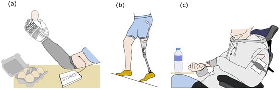 Clinical trials performed using the STIMEP Neurostimulator. (a) Implantation of TIME electrodes transversally in upper limb nerves and stimulation with STIMEP device to restore rich sensations in amputees [,,,]. (b) Combined use of TIME implants and STIMEP to optimize walking performances in lower-limb amputees [,]. (c) Restoration of upper-limb movements in individuals with spinal cord injury using multicontact cuff electrodes and STIMEP neurostimulator (ongoing clinical trial—manuscript in preparation).