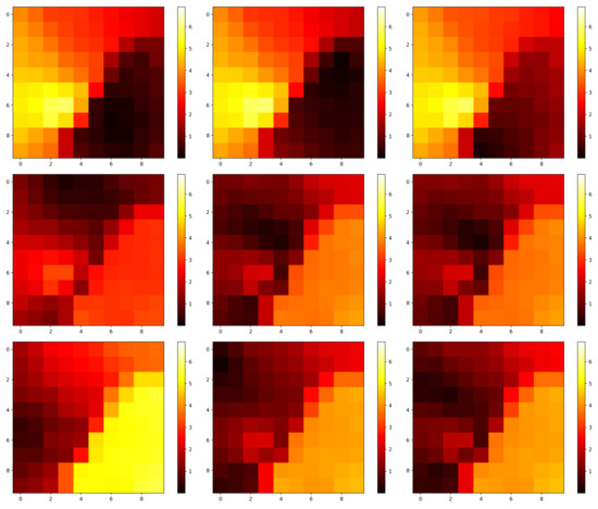 One of the new ideas proposed in this paper is to define a new object called U-image. The U-map is defined for the trained Kohonen neural network. We define the U-image for each example, training or testing, on the basis of a trained Kohonen map. At this point, we propose, by analogy with the U-map creation process, to define the U-image as follows. For a given , training or test example, prepare a U-image by assigning a value to each neuron in a 2D network equal to the Euclidean distance of that neuron’s weights from the feature vector . These values, properly scaled, can be used to present as a 2D image, without no matter what the original dimensionality of is. The procedure for creating a U-image is presented as Algorithm 2. Figure 2 shows in each row three examples from a different class in the iris database, presented as U-images. Clearly, visualization with U-images is able to capture the similarity of examples from the same class as well as differences between classes.