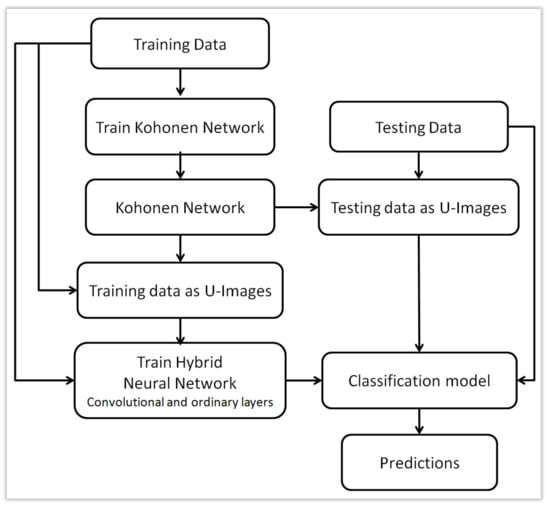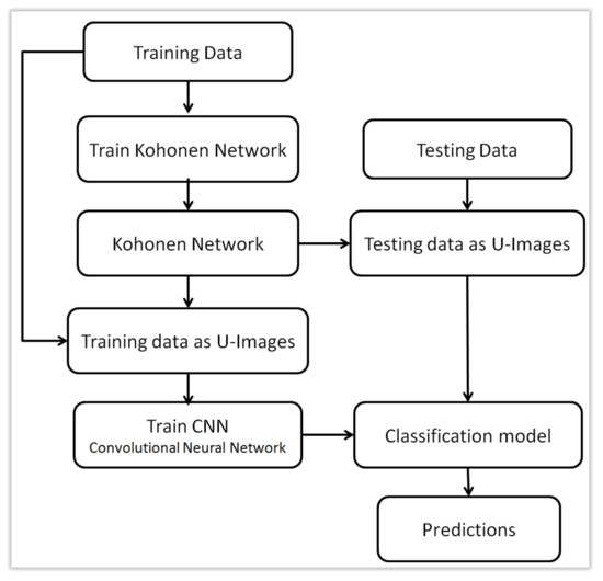 In this work, we propose to combine the functionality of convolutional networks [1] and Kohonen networks [2]. Each of these networks has played an essential role in the development of computational intelligence methods. CNN networks are one of the primary sources of deep learning success. They have been used in image recognition [3,4,5], facial analysis [6], speech recognition [7], analysis of ECG records [8,9], analysis of medical images [10], natural language processing [11], and many other problems of classification of sequential data, i.e., videos, images and time series. Their key role in computational generative methods such as autoencoders [12] and generative-adversarial networks (GANs) [13] cannot be overlooked either. The use of convolutional filters allows for a significant saving of memory, which allows the construction of larger models. On the other hand, Kohonen networks played a significant role in unsupervised learning algorithms in problems of data analysis and visualization. One of the methods of data visualization using the Kohonen network, called U-matrix, has been described in [14,15]. It is an inspiration for the U-image proposed in this work. It is impossible to thoroughly review the techniques involved in both network types and their wide application to many problems in this work. However, it is worth emphasizing that they are combined innovatively to enable their even more comprehensive application in this work.