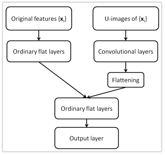 U-images obtained for examples based on a previously trained Kohonen map can be treated as a new, alternative form of representation of the original data . These are images, so although the original data was not sequential, now the new representation allows them to be used as input to convolutional layers in a neural network. This idea is the main novelty presented in this work. This approach will be presented in two versions. First, U-images can replace the original data , which makes it possible to use a traditional convolutional layer whose input are images. This approach is schematically presented in Figure 3. The second approach, which can be called hybrid, combines the original representation with a new representation using images. This idea is presented in Figure 4 while the architecture of a hybrid neural network with two types of input data is presented in Figure 5. Both forms of representation are used as input to the neural network, with images being processed by convolutional layers and the original representation by ordinary flat layers of neurons.