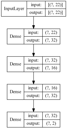 For each dataset, the following neural architectures of ordinary feed-forward neural networks were tested: 32, 16-32, 32-32, 16-16-32, 32-16-32, 32-32-32, where the values represent the numbers of neurons in successive hidden layers. Thus, for example, 32-16-32 describes a neural network with three hidden layers with the number of neurons in each successive hidden layer 32, 16 and 32, respectively. The input to the networks were vectors of features. Figure 6 presents such a model configured for parkinsons dataset (22 original features).