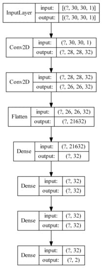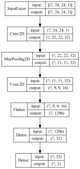 In the neural network diagrams shown in Figure 6, Figure 7, Figure 8 and Figure 9, the sizes of the tensors describing the input and output of a given layer are shown in parentheses. The question mark represents the number of training/test examples. In general, it is not known, so the question mark acts as a placeholder. For example, in Figure 7, the input of the first convolutional layer is described by a tensor of size (?, 24, 24, 1), which means that the network input is an image with a size of 24 × 24 pixels and one channel (in this case it is a U-image obtained from Kohonen’s map with a size of 24 × 24 neurons). Thirty-two feature maps, each of the size of 22 × 22 pixels, are the output of this layer.