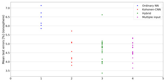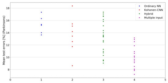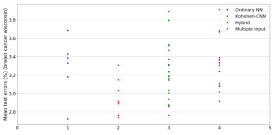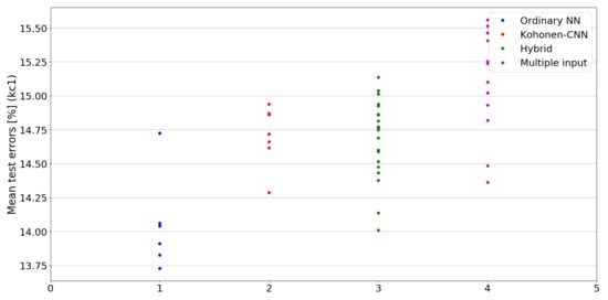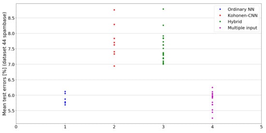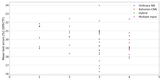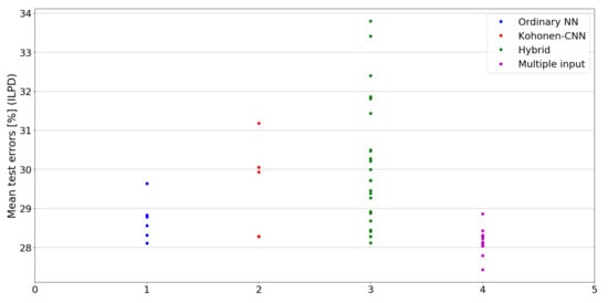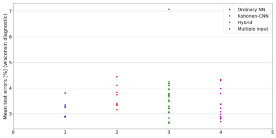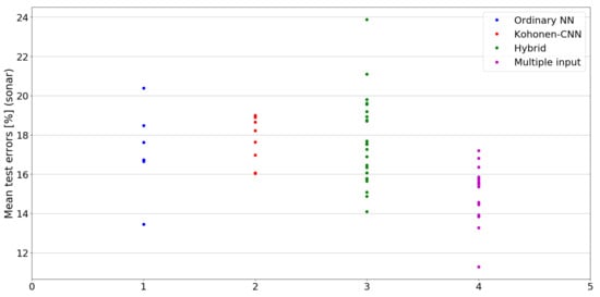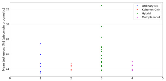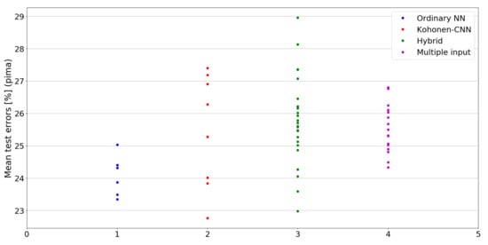 The benefit of the proposed method is sometimes higher and sometimes lower.It is natural to ask how difficult it is to find the correct neural network architecture. A general answer to this question is impossible, however Figure 10, Figure 11, Figure 12, Figure 13, Figure 14, Figure 15, Figure 16, Figure 17, Figure 18, Figure 19, Figure 20, Figure 21, Figure 22, Figure 23, Figure 24 and Figure 25 show mean cross-validation test errors for each neural architecture tested in each group. There were 6, 8, 24 and 16 different configurations of ordinary feed-forward neural networks, Kohonen-CNN, hybrid (with additional hidden flat layers) and multiple input, respectively. The details are presented in previous sections. We can observe that the degree of the usefulness of the proposed technique varies among the classification problems. For the Parkinsons problem the proposed method brought about the most remarkable improvement compared to classic networks. In Figure 17, we see that the combination of the original attributes with the U-image representation worked out especially well in this case. Some U-image-only networks (Kohonen-CNN and Hybrid) performed better but some performed worse. Nevertheless, the potential of the proposed method is visible here. Figure 22 shows a similar plot for the SPECTF problem, in which the proposed method also gave better results, but the improvement was not as significant as for the Parkinsons problem. The proposed U-image representation works very well for ionosphere, too (Figure 13). On the other hand, for dataset 44 spambase (Figure 11) the need of the original features seems to be obvious. In general, finding the right U-image-based architecture is not straightforward, but the improvement is possible in many cases. The proposed method allows searching for additional configurations compared to using only the feed-forward networks.