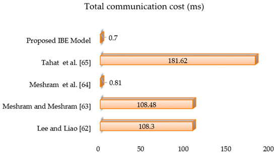 Table 3 lists the functions of the proposed IBE transformation model, and Figure 5 compares the computational costs of relevant models by [62,63,64,65]. Based on the findings of the tests in [6,8,60,66] we arrive at the following computation time statistics with unit hashing time: , and . The order of computational complexity in this method is as follows: . The computation time of the cryptographic primitives was measured using a 32-bit Cortex-M3 microcontroller running at 72 MHz in a simulation hardware environment [67]. A one-way hash function takes 0.06 milliseconds (ms) [8,67] and that [8]. Total communication costs for references by [62,63,64,65], as well as the proposed IBE transformation model, are 108.3 ms, 108.48 ms, 0.81 ms, 181.62 ms, and 0.70 ms, respectively. It should be noted that the transformation model based on extended conformable Chebyshev chaotic maps created in this paper has a lower computing cost than [62,63,64,65] and is probably secure in a random oracle than [62,65]. The work of [64] is based on an extended chaotic map, but the proposed work is based on conformable Chebyshev chaotic maps. In our proposed IBE transformation scheme, the design leverages Chebyshev polynomials and conformable calculus. In particular, conformable calculus helps to significantly increase the security of the cryptographic scheme compared to the cryptographic scheme, which is based on chaotic maps, owing to the selection of arbitrary rational number . As a result, an adversary cannot calculate the arbitrary rational number to break the security of the proposed technique. Also, the proposed scheme requires minimum communication cost when compared to the scheme reported in [64]. We arrive at the following computation time values with unit hashing time based on the experimental results in [6,8,60,66].