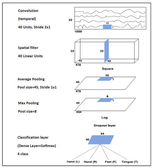 A shallow architecture that performs temporal and spatial convolutions is used here. The temporal convolutional layer with a 45 1 filter and 40 channels has input tensors of size 1000 22 1 and output tensors of size 478 22 40 when using dataset 2a, while input tensors of size 1000 3 1 and output tensors of size 478 3 40 are used for dataset 2b. Then, downsampling from 250 to 125 Hz by employing a stride of 2 is performed. The spatial convolutional layer is composed of 40 channels and a 1 22 filter when using dataset 2a and a 1 3 filter when using dataset 2b. After the temporal convolution and the spatial filter, a squaring nonlinearity, an average pooling layer with 45 1 sliding windows, a max-pooling layer with an 8 1 stride, and a logarithmic activation function are applied. These steps together are analogous to the trial log-variance computation, which is widely used in the Filter Bank Common Spatial Patterns (FBCSPs) [30,44]. The use of quadratic activation functions, or even higher-order polynomials, is not new in neural network research [45], and to the best of our knowledge, it was first used in BCI applications by Schirrmeister [31]. The classification layer is composed of a dense layer with Softmax activation function that receives a total of 2160 features. To avoid overfitting, batch normalization and dropout layers are used, and also the “MaxNorm” regularization is further applied in both convolution and dense layers. Moreover, the “Early Stopping” method and the decay of learning rate are also considered. The Adam optimizer [46] and the Categorical Cross-Entropy as a cost function are employed. As a result, the proposed architecture contains a total of 45,804 weights for dataset 2a and 11,082 weights for dataset 2b.