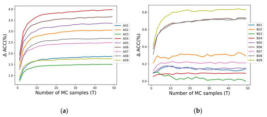 According to [23], is considered a safe choice to estimate the uncertainty, but this value must also be evaluated, considering the predictive performance of MCD. In our study employing the SCNN architecture (see Figure 2), the performance by applying MCD through different samples was analyzed for each subject in both datasets 2a and 2b. Figure 3 shows the accuracy improvement (∆ ACC) from the baseline . We observed that generally when increases, the accuracy of SCNN-MCD improves, reaching an evident stabilization for values prior to . For this reason, was adopted in SCNN-MCD.