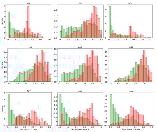 The histograms of predictive normalized entropy for correct (green) and incorrect (red) classified predictions on BCI Competition IV dataset 2a.