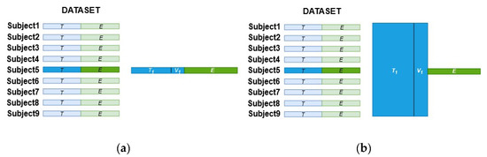 A first experiment to evaluate the accuracy performance by applying the SCNN-MCD approach was carried out. For the second experiment, a Monte Carlo dropout of an ensemble (E-SCNN-MCD) was executed in order to verify its feasibility to discriminate MI tasks. Finally, a third experiment to analyze the uncertainty of predictions during MI tasks classification was performed for both SCNN-MCD and E-SCNN-MCD approaches. All experiments were designed according to the conditions of the BCI competition IV to compare directly with recent works that also employed this dataset. For this, the training set (the first session from dataset 2a and the first three sessions from dataset 2b) was employed to calibrate the recognition system, while the testing set (the second session from dataset 2a and the last two sessions from dataset 2b) was used only for evaluation. A repeated holdout validation over the same testing set was carried out for both subject-specific and non-subject-specific classification strategies to evaluate the model generalization. For instance, the training set was split randomly into new sets , one for training ( and the other for validation (), repeating this random procedure 16 times (. Once the model was trained for each and , the average accuracy was calculated by using the testing set . Figure 5a,b show the strategy to select the training and testing sets for both subject-specific and non-subject-specific strategies, respectively. As a result, when applying the subject-specific classification, the training data are composed randomly of trials from the training set of the same subject, as shown in Figure 5a for Subject 5. In contrast, when using the non-subject-specific strategy, the training data are selected randomly from the training set of all subjects, as shown in Figure 5b for Subject 5.