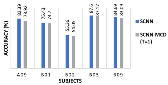 Table 4 and Table 5 show that the SCNN-MCD approach increased the mean ACC on both databases (2.5% for dataset 2a and 1.4% for dataset 2b), outperforming generally the SCNN approach. The SCNN-MCD improved its accuracy for most subjects, in comparison to SCNN, although it also decreased the ACC on some subjects (A06, A07, B03, and B05), indicating possibly co-adaptation [24,51]. The highest ACC improvement occurred on subjects A01 (8%), A02 (7%), and A05 (4.75%) from dataset 2a as well as on B01 (6.55%) from dataset 2b.