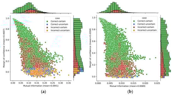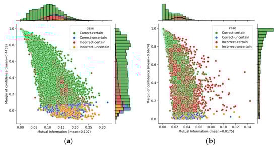 The bivariate distribution of predictions by using mutual information and margin of confidence for Subject A05: (a) SCNN-MCD approach; (b) E-SCNN-MCD approach.