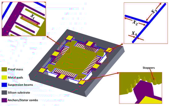 Figure 1 shows the schematic of the proposed two degree-of-freedom (2-DoF) MEMS accelerometer design conceptualized considering the constraints imposed by the commercially available SOIMUMPs microfabrication process offered by MEMSCAP Inc. USA [36]. The main constraints of the SOIMUMPs process are (a) no bottom electrode is available for the out-of-plane proof mass displacement sensing and (b) the design cannot have anchors in the middle of the proof mass, thus limiting the position of the mechanical springs to the outer side of the mass. For sensing the proof mass displacement, corresponding to an input acceleration, parallel plate combs are attached to each of the four sides of the proof mass. The stator combs are located between the two rotor combs, attached to the proof mass, in a gap–antigap configuration. To obtain maximum capacitance change, the ratio of the larger gap to the smaller gap between combs is kept at 3 with gap and antigap values of 2.5 µm and 7.5 µm, respectively. The suspension beams are T-shaped and are designed symmetrically on the four corners of the proof mass to minimize the cross-axis coupling and increase stability. To minimize the effect of sudden high acceleration values, end stoppers are designed on the proof mass corners. The capacitance sensing mechanism is based on the gap closing mechanism and both stator and rotor combs are attached in differential sensing configuration to obtain the maximum capacitance change. The thickness of the structural silicon-on-insulator (SOI) layer in the whole structure is 25 μm.