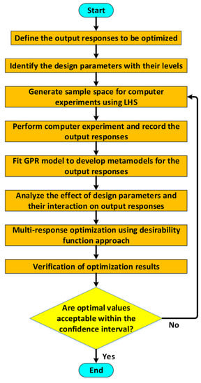 A generalized form of Gaussian distribution is termed as Gaussian process (GP), which is a type of continuous stochastic process. It is used to describe the probability distribution over functions and the model developed by GP is a conditional probabilistic model. When fitting data from a deterministic computer experiment, the Gaussian process model is frequently utilized. Sacks et al. [31] presented these models as models for computer experiments. They are desired because they give an exact fit to the data gathered from computer experiments and only need a single parameter for every design parameter. The optimization design space can be represented as of runs, where ; is the D-dimensional vector of input design parameters for each run and is the scalar value of the output response. The design parameters and the output responses for the runs can be written in a matrix and , respectively. The Gaussian process model for an output response is defined as [26]: