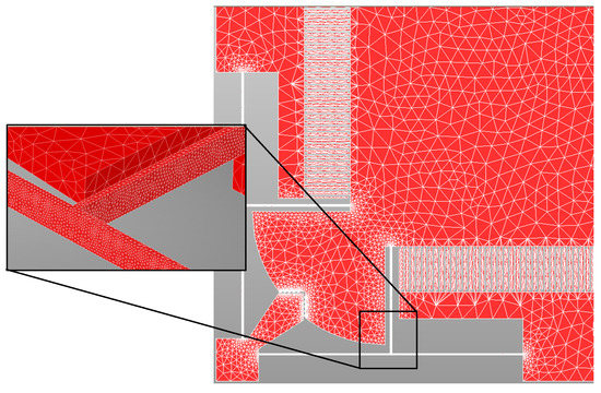The output responses, corresponding to the LHS based design matrix, are obtained through FEM simulations in CoventorWare®® software. The MEMS accelerometer is meshed using three-dimensional (3D) solid tetrahedral 739,599 elements with a total number of 272,580 elements for the central proof mass and elements for the mechanical suspension beams. A fine mesh is used for the mechanical suspension beams, with multiple elements along the thickness, as shown in Figure 3. The material properties of thin film Silicon are included as input in the FEM analysis with Young’s Modulus of 169 GPa, Poisson ratio of 0.29, and density of 2300 kg/m3 [36].