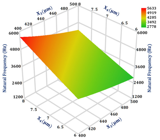 Response surface plot for natural frequency as a function of design parameters X3 and X4.