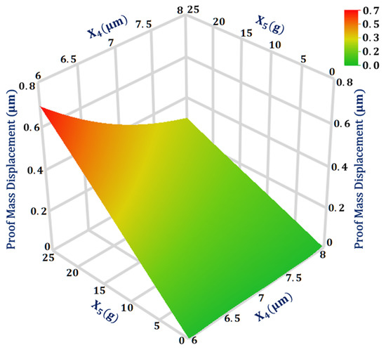 Response surface plot for proof mass displacement as a function of design parameters X4 and X5.