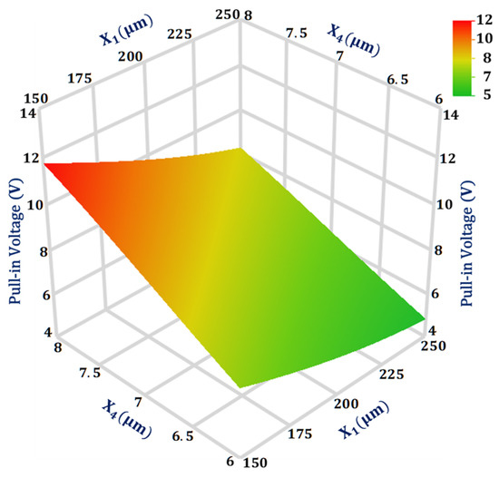 Response surface plot for pull-in voltage as a function of design parameters X1 and X4.