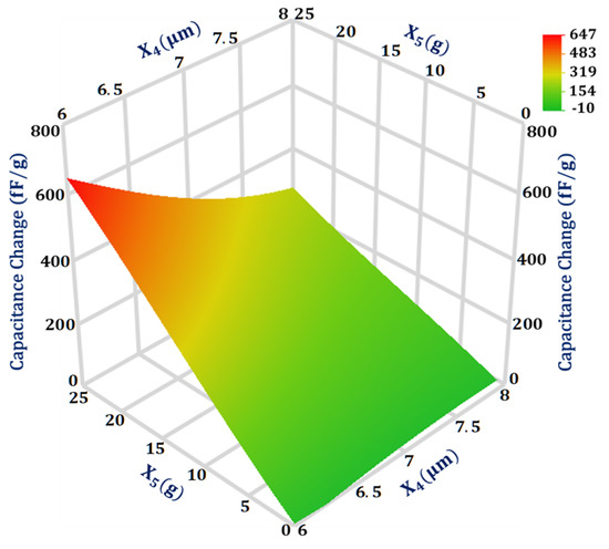 Response surface plot for capacitance change as a function of design parameters X4 and X5.