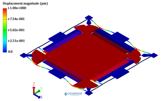 The natural frequency of the MEMS accelerometer is obtained through modal analysis in the CoventorWare MemMech module. The proof mass displacement, corresponding to an input acceleration, is obtained for each simulation run using harmonic analysis and considering the air damping effect. In the dual-axis MEMS accelerometer design, both the squeeze and slide air film damping result in energy dissipation. For an input acceleration, the squeeze film air damping occurs between the stator and rotor combs in the active sense axis, and a slide film air damping occurs between the two sets of combs in the inactive axis. In the present work, for each simulation run, the value of air damping is first computed by using the CoventorWare DampingMM module and subsequently used in the harmonic analysis. In the FEM analysis, the gas rarefaction effects are considered for each simulation run since the dominant airflow regime is slip flow for an air gap of 2.5 μm between the stator and rotor combs of the MEMS accelerometer. For each simulation run in the design matrix, the computed values of squeeze number and Reynolds number are in the range of 10−3 thus air compressibility and inertial damping effects are ignored. A detailed description of modelling of thin film air damping effects in capacitive sensing combs is given by the authors in [40,41].