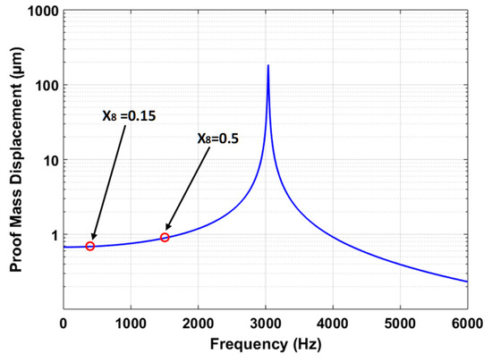 The predicted value of the output response proof mass displacement is verified by using the harmonic analysis in the CoventorWare MEMS+ module. Figure 12 shows the frequency response curve for the MEMS accelerometer at an input acceleration of 25 g. The results show that at frequency ratio () of 0.5, the displacement amplitude of the proof mass is 0.898 µm. lies within the 95% prediction confidence prediction interval, i.e., 0.891 µm ≤ = 0.898 µm ≤ 0.915 µm. The = 0.5 corresponds to an operational bandwidth of 1519 Hz. However, the MEMS accelerometers are generally designed for operational bandwidth of 0–450 Hz. Figure 12 shows that for = 0.15 with operational bandwidth of 0–450 Hz, the proof mass displacement amplitude is relatively linear with a maximum value of 0.688 µm for the proof mass displacement.
