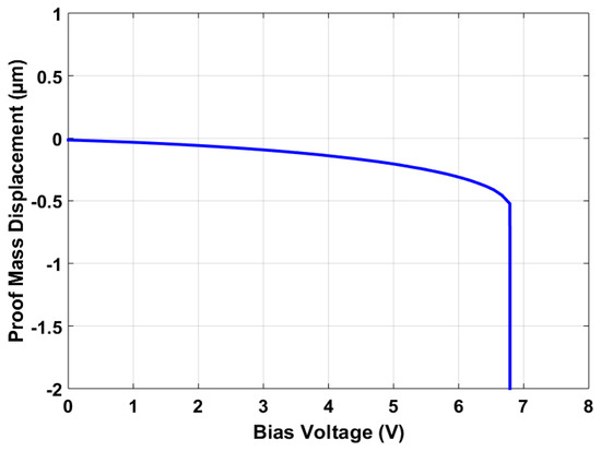 Figure 13 shows the bias voltage vs. proof mass displacement graph for the final optimized MEMS accelerometer design. The results show that the maximum bias voltage that can be applied to the stator and rotor sensing combs must be less than the maximum pull-in value of 6.79 V. This pull-in voltage value is in close agreement with a predicted value of 6.76 V and lies within the 95% confidence prediction interval, i.e., 6.36 V ≤ = 6.79 V ≤ 7.16 V.