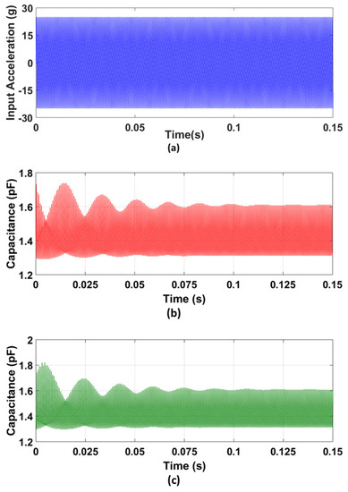 For the verification of the predicted capacitance change for the final optimized MEMS accelerometer design, the accelerometer model developed in the CoventorWare MEMS+ module is interfaced with MATLAB Simulink. A bias voltage of 2.25 V is applied between the proof mass and stator electrodes, since the proposed accelerometer is designed to be interfaced with the commercial capacitive to voltage conversion readout IC, MS3110 [50]. An input acceleration of 25 g at = 0.5, i.e., 1519 Hz is given as an input to the MEMS accelerometer, as shown in Figure 14a. Figure 14b,c show the corresponding gap and anti-gap capacitance. The net change in capacitance is 694 fF which is close to the predicted value of 676.2 fF and lies within the 95% confidence prediction interval, i.e., 618 fF ≤ = 694 fF ≤ 735 fF. For = 0.15, i.e., an input acceleration frequency of 450 Hz, the net change in capacitance for the MEMS accelerometer is 523 fF.