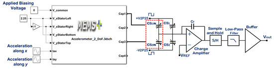 One of the important performance parameters for MEMS accelerometers is voltage sensitivity which is dependent on the capacitive to voltage readout electronics to estimate the voltage sensitivity of the optimized MEMS accelerometer, the behavioral model of the accelerometer is interfaced with the commercially available capacitance to voltage convertor Universal Readout ICTM MS3110 [50] in MATLAB Simulink environment. This readout circuitry is capable of measuring both single and differential capacitance with a resolution of . Figure 15 illustrates the integration of 2-DoF MEMS accelerometer behavioral model with MS3110. The working principle of the IC for the measurement of differential capacitance is based on charge amplification, followed by sample and hold, a low-pass frequency filter, and a buffer amplifier. A bias voltage of 2.25 V is applied between the proof mass and stator electrodes of the MEMS accelerometer. For an input acceleration along X-axis, the capacitance mismatch between the input capacitors, the difference is zero and will be equal to the difference between the capacitors Cap1 and Cap3 as obtained in the capacitance change analysis section. The feedback capacitor value is adjusted to 3.2 pF to keep the output voltage in the range of 0.5 to 4 V. Figure 16 shows the effect of change in input acceleration on the output voltage of the readout interface circuit. The graph shows that the maximum and minimum values for output voltage are 3.93 and 0.573 V respectively with a voltage sensitivity of 65.4 mV/g for the final optimized MEMS accelerometer design.