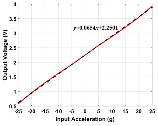 The output voltage of the readout electronics for an input acceleration in the range of −25 g to +25 g along the X-axis.