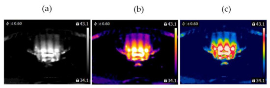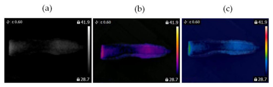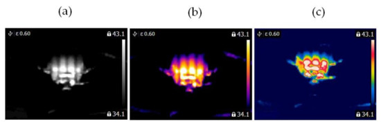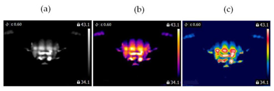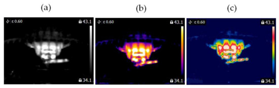 Blocked ventilation of the BLDC motor at 2100 rpm (a) gray-scale, (b) iron scale, (c) rainbow scale.