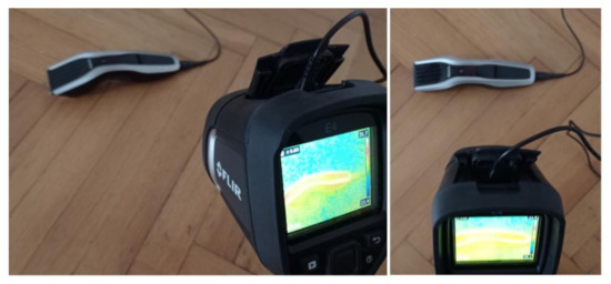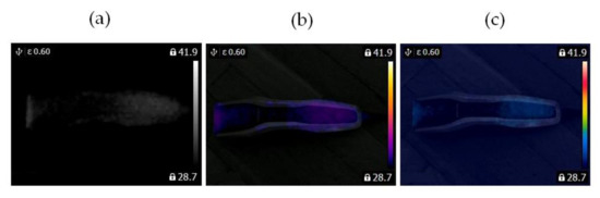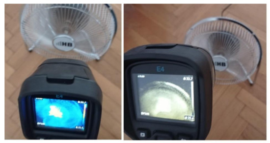 Thermographic measurements were carried out in a room (4 m × 5 m). The BLDC motor was at a distance of 0.2 m from the thermal imaging camera (Figure 11 and Figure 12). The BLDC motor of the fan has the following parameters: POBLDC1 = 25 W (power of the BLDC), RASBLDC1 = 1450 rpm, RASBLDC1 = 2100 rpm (rotor angular speed), VOBLDC = 230 V/50 Hz (voltage), WEFAN = 1.6 kg (weight of the fan). The BLDC motor of the clipper has POBLDC2 = 5.4 W (power of the BLDC). The parameters of the FLIR E4 camera are as follows: temperature measuring range (−20 °C to +250 °C), resolution of images (80 × 60), its thermal sensitivity is less than 0.15 °C, and the image frequency is equal to 9 Hz. Images of 80 × 60 pixels were converted to images of 320 × 240 pixels using FLIR software. The thermal camera was vibrating in the range of 0–0.5 m/s2. Different measured thermal images were used. A movie was recorded for two devices (two fans, two clippers). The thermal imaging camera was set at the highest temperature of the analyzed state, that is, blocked ventilation of the BLDC motor at 2100 rpm. The measurements were performed after a steady state was reached so as to avoid the negative effects of transients in the damage detection method. Measurements were carried out for 30 s of operation of the motor. The parameter ε (emissivity coefficient) was equal to 0.6. The parameter ε is between 0.62–0.73 for various types of steel. Rolled sheet steel (temperature 21 °C) has an emissivity coefficient equal to 0.660. Stainless steel 303, after 42 h of heating at 527 °C (temperature 216–527 °C) has an emissivity coefficient equal of 0.620−0.730 [22]. The author selected ε = 0.6 and it was good enough for measurements. Nylon covering was used for the detection of fan faults. The nylon blocking the ventilation leads to a temperature increase (indicative of damage for many conditions), but it does not affect the thermal imaging equipment thanks to its transparency. Nylon covering was used to simulate damage, thus allowing us to implement damage detection.