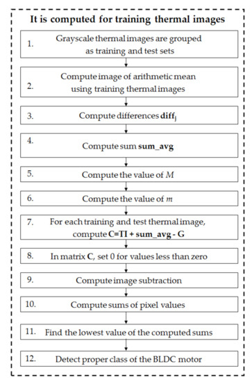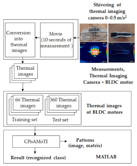 Figure 13. Measurements were carried out using a thermal imaging camera FLIR E4 and a computer. The gray-scale movie was captured and then the movie was converted into gray-scale thermal images (format TIFF, 256 colors). Then, the CPoAMoTI method was used to compute patterns. It was used for training and test sets (66 and 360 gray-scale thermal images—6 classes for two BLDC motors). Next, image subtraction was carried out and differences in the images (test and training) were computed. Next, the sum of the pixels of the computed differences was calculated. The differences in the images determine the recognized class.