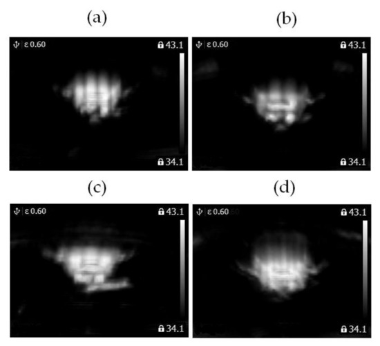 (a) Image of arithmetic mean of thermal images of the healthy BLDC motor at 1450 rpm (class1). (b) Image of arithmetic mean of thermal images of the healthy BLDC motor at 2100 rpm (class2). (c) Image of arithmetic mean of thermal images of the blocked ventilation of the BLDC motor at 1450 rpm (class3). (d) Image of arithmetic mean of thermal images of the blocked ventilation of the BLDC motor at 2100 rpm (class4).
