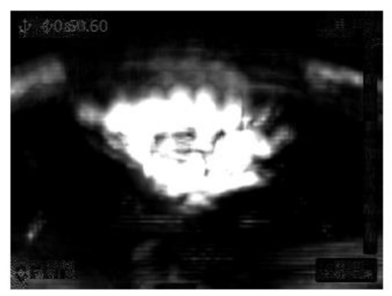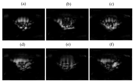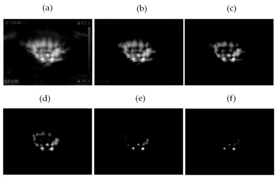 The value of M, the maximum of matrix sum_avg is equal to 2.8784 for the considered training thermal images. This maximum is used for the equation m = p × M. The author analyzed the following p parameters: 0; 0.3; 0.5; 0.7; 0.9; 1.0. Next, step 7 was performed: C = TI + sum_avg − G. The thermal images of the healthy BLDC motor at 2100 rpm for different parameters p are shown in Figure 18.