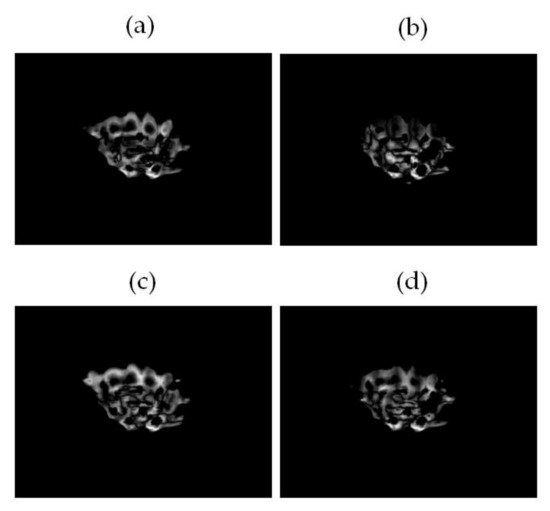Thermal images of the healthy BLDC motor at 2100 rpm for parameter p = 0.3–0.5 are the best recognized by the human eye (Figure 18b,c). Step 9 performs image subtraction. This step is similar to the KNN classifier [23,24]. Forty-four training thermal images were used (for fans). For each test thermal image, there are 44 differences. Four differences (of 44 computed differences, parameter p = 0.5) are presented in Figure 19.