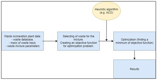 One of the artificial intelligence algorithms, belonging to the group of swarming algorithms, was used to minimize the objective function—the ant algorithm, described in more detail below. This algorithm is characterized by a relatively simple implementation. Moreover, it is not necessary to make assumptions about the nature of the objective function, namely its continuity or differentiability. The operation of the algorithm can be simplified as follows: the algorithm receives a set of waste from which a mixture is to be made, and then selects the masses of individually selected waste so that their mixture is characterized by model values [12,13,14,15,16].